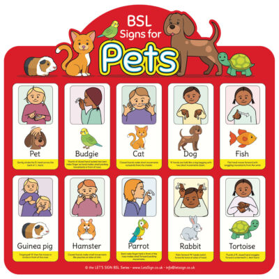 Our BSL pets sign is perfect for school and nursery classrooms, forest schools, day-care centres or any other educational establishment where British Sign Language is used with children.