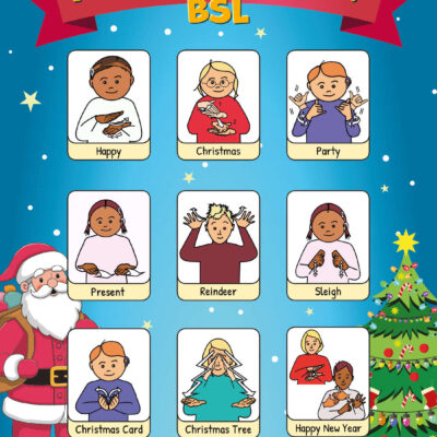 The sign depicts a range of common words used at Christmas time, including words related to parties, presents, sleighs and reindeer. We also have an alternative set of Christmas words in BSL that you can find here.