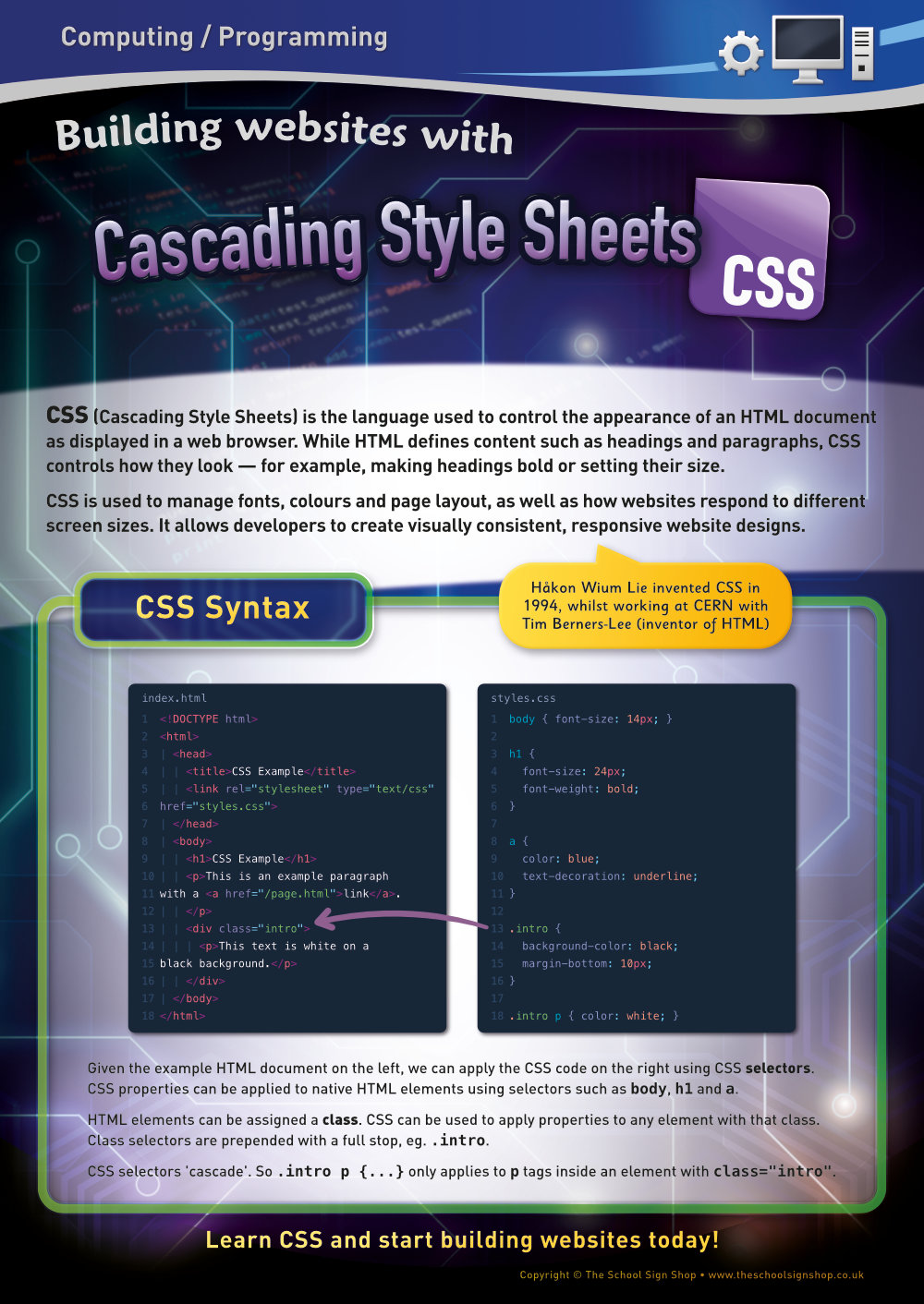 Explanatory text supports the code examples and helps describe important aspects of CSS, such as CSS selectors and properties. This makes the sign a useful point-of-reference during lessons, revision sessions and independent work.