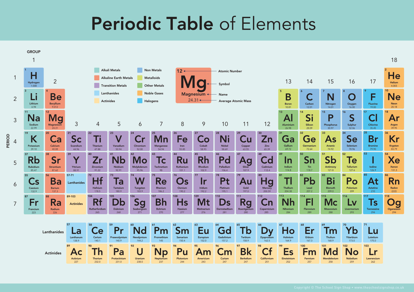 Colour-coding is used to distinguish between different element categories — such as alkali metals, noble gases, transition metals and non-metals — helping students visualise trends in reactivity, state and atomic structure. This makes the sign particularly useful when introducing core KS3 and KS4 topics including atomic theory, bonding, electron configuration and periodicity.